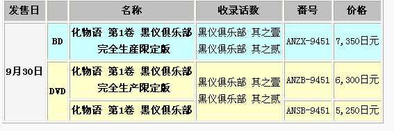 7月新番《化物语》刚开始播放,制作方那边已经开始着手DVD和BD化了,并确定在9月30号发售。预定收录第1、2话,限定生产的BD价格为7,350日元,DVD则分为限定版和普通版,限定版6,300日元,普通版5,250日元。